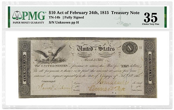 The centerpiece of the sale is an 1815 $10 Treasury Note graded PMG 35 Choice Very Fine (lot 20015), with an estimate of at least $200,000. These notes were issued during and immediately after the War of 1812, which strained US finances before peace was achieved in 1815.