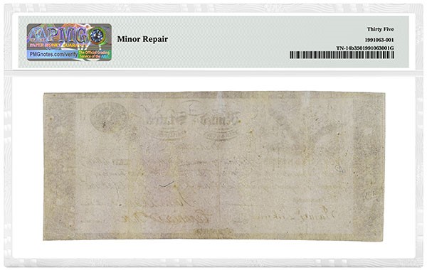 Interestingly, this is one of only two fully issued 1815 notes known to be triple-signed. The other, a $3 example graded PMG 25 Very Fine, realized $168,000 in a Heritage sale in November 2020. Both notes are pedigreed to the Mike Coltrane Collection, which boasts some of the greatest rarities in American numismatics.