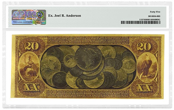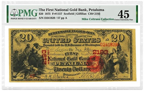 Another great rarity in the sale is an 1875 $20 National Gold Bank Note issued by The First National Gold Bank, Petaluma graded PMG 45 Choice Extremely Fine (lot 20190). It has an estimate of at least $150,000.